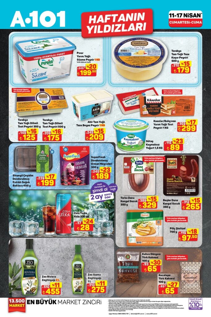 A101 11-17 Nisan Haftanın Yıldızları kataloğu yayında! Temel gıda, kahvaltılık, süt ürünleri, atıştırmalık, temizlik ve kişisel bakım ürünlerindeki dev indirimleri inceleyin.