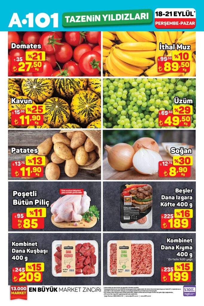 A101 19-25 Eylül haftanın yıldızları kampanyası ile çikolata, baklava, kağıt havlu, enerji içeceği, meyve suyu, bulaşık deterjanı,cips, makarna, yoğurt, tahin, patates, et ürünleri ve zeytinyağı gibi çeşitli ürünlerde %50’ye varan indirimler sizleri bekliyor! Taze ve uygun fiyatlı alışveriş için hemen A101’e!