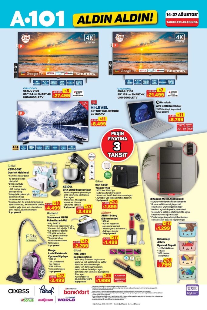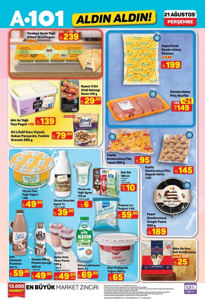 A101 Aldın Aldın aktüel ürünler kataloğu 21-27 Ağustos 2025 tarihleri arasında geçerlidir. 14 sayfalık A101 broşüründe gıda, temizlik, elektronik, TV, bisiklet ve beyaz eşyadan onlarca üründe kampanyalı fiyatlar sizi bekliyor. Güncel A101 indirimlerini ve fırsatlarını kaçırmayın!