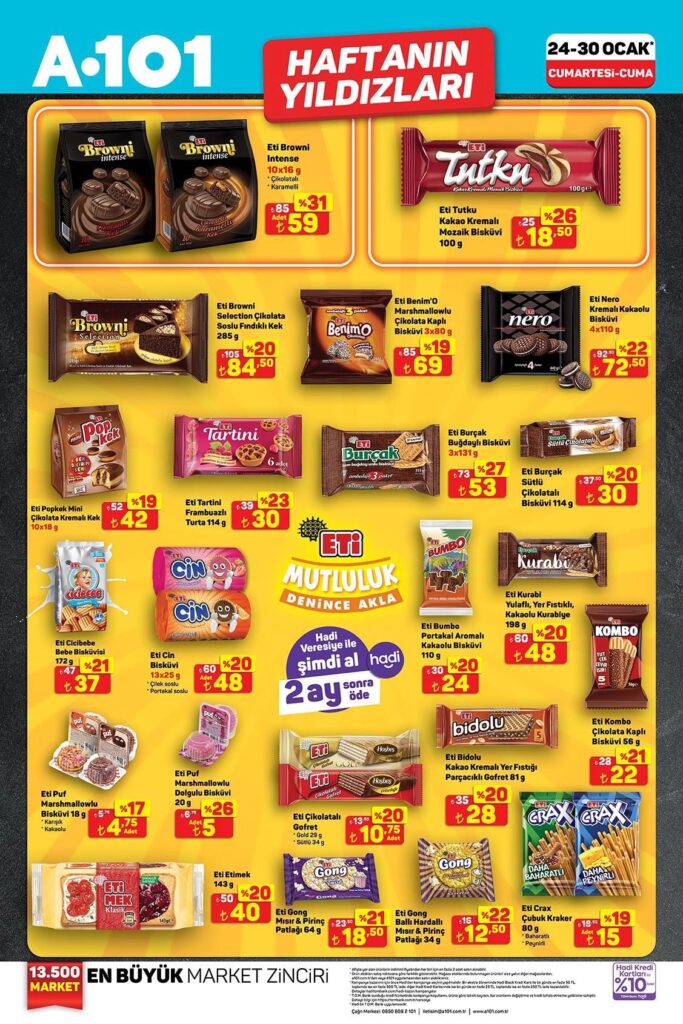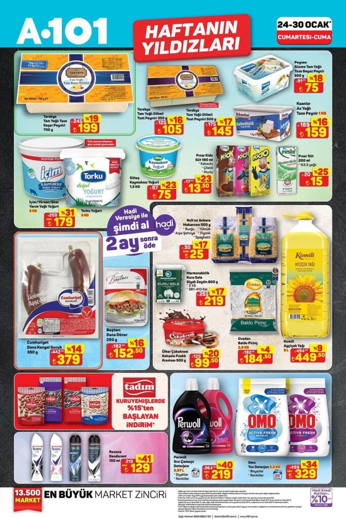 A101 Haftanın Yıldızları aktüel ürünler kataloğu 24-30 Ocak 2026 tarihleri arasında geçerlidir. A101 broşürü 5 sayfadan oluşmaktadır. Bu haftaki katalog gıda ve temizlik ürünleri ağırlıklı.