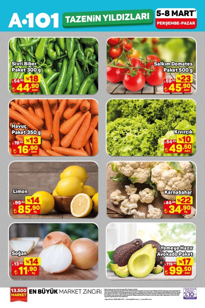 A101 Haftanın Yıldızları aktüel ürünler kataloğu 7 Mart – 13 Mart 2026 tarihleri arasında geçerlidir. A101 broşürü 5 sayfadan oluşmaktadır. Bu haftaki katalog gıda ve temizlik ürünleri ağırlıklı.