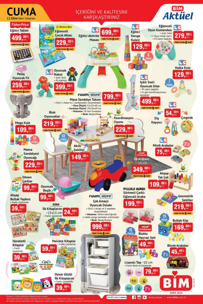 Oyuncak ürünlerinde de çeşitlive kaliteli ürünlere geniş yer veriliyor. Ruumstore markasına ait masa sandalye takımı ve LC eğitici aktivite masası çocuklarınız için rahat bir aktivite alanı oluşturacak nitelikte. Peluş fil, yapboz çeşitleri, denge kulesi, mega kule, minik arabalar, bloklu hayvan seti, çeşitli kitaplar, yapboz çeşitleri BİM 11 Ekim Aktüel Ürünler Kataloğunda yer alıyor. Herkesin ilgi ile beklediği Çok Amaçlı Oyuncak Dolabını da tüm BİM marketlerde bulabilirsiniz.