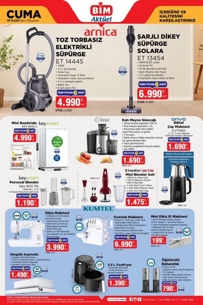 BİM 19 Eylül Cuma Aktüel Ürünler broşürü 7 sayfadan oluşmaktadır. 19 Eylül–25 Eylül 2025 tarihleri arasında geçerli olacak indirimler tüm BİM marketlerde geçerlidir. Bu haftaki katalogda mutfak eşyalarından elektronik ürünlere kadar çok geniş yelpazede ürünler mevcut.