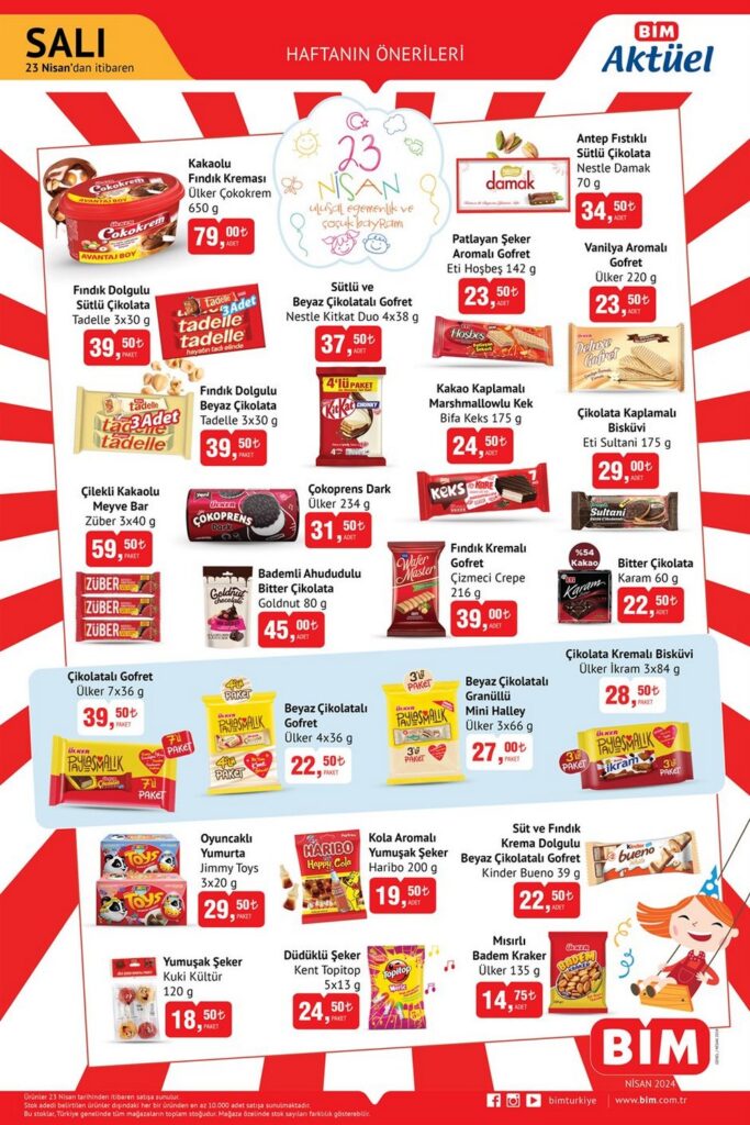 Yeni BİM Aktüel ürünler broşürü 23 – 29 Nisan 2024 tarihleri arasında tüm BİM marketlerde geçerlidir. Aktüel Ürünler Kataloğu 4 sayfadan oluşmaktadır. Yeni BİM aktüel ürünlerde bu hafta atıştırmalıklar ve temizlik ürünleri ağırlıklı olarak yer almakta.