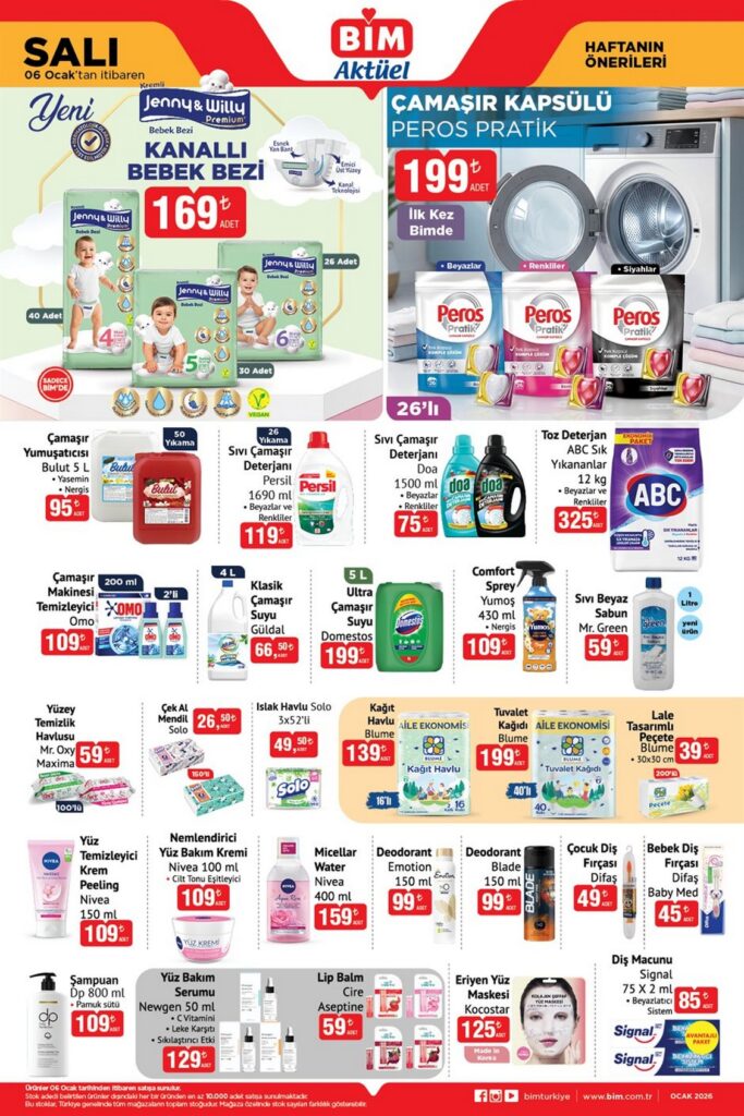 BİM 6 Ocak 2026 Aktüel kataloğu ile haftanın indirim fırsatlarını keşfedin! Namet sucuk, Banvit piliç ve Teksüt peynir çeşitleri gibi kahvaltılık ve et ürünlerinden; Jenny & Willy bebek bezi, Peros deterjan ve Nivea kişisel bakım ürünlerine kadar dev indirimler sizi bekliyor.