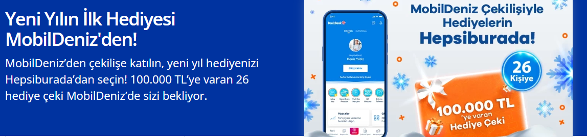 DenizBank A.Ş. tarafından düzenlenen “MobilDeniz Hediye Çeki Çekilişi”, mobil bankacılık kullanıcılarına muhteşem ödüller kazanma şansı sunuyor. 10 Kasım 2025 – 4 Ocak 2026 tarihleri arasında MobilDeniz uygulamasını kullanarak kampanyaya katılan 26 şanslı kişi, toplam 385.000 TL değerindeki Hepsiburada hediye çeklerinden birini kazanma fırsatı yakalayacak.