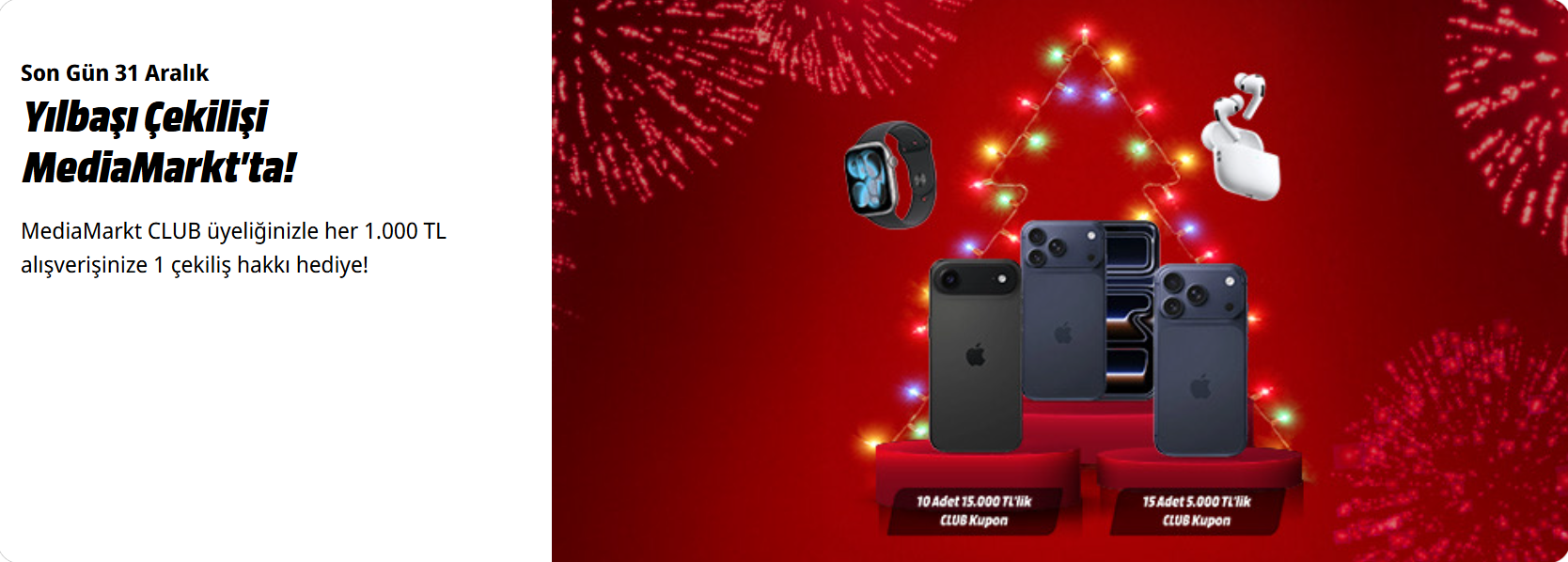 MediaMarkt Türkiye, teknoloji severler için hazırladığı yıl sonu kampanyasıyla 2026’ya ödüllerle girmeye hazırlanıyor. 12 Aralık 2025 – 31 Aralık 2025 tarihleri arasında MediaMarkt CLUB üyelerine özel düzenlenen bu kampanyada, yapılacak alışverişler iPhone 17 serisi, Apple Watch 11 ve binlerce liralık MediaMarkt CLUB Kuponu kazanma şansına dönüşüyor. Kampanyaya katılım koşulları, ödül detayları ve çekiliş takvimini sizler için derledik.