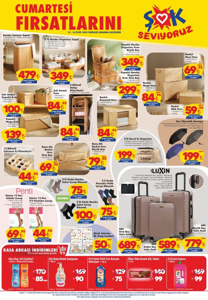 13-16 Eylül 2025 Şok Cumartesi indirimleri: Bambu organizer, hurç, dolap sepeti, bavul, çorap askısı, çocuk kitabı, bebek şampuanı ve deterjan gibi ev eşyaları ve kişisel bakım ürünleri uygun fiyatlarla! Ev organizasyonu için kaçırmayın!