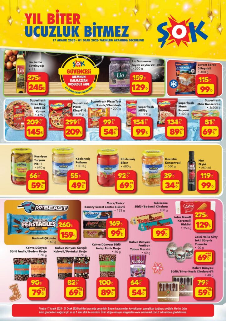 ŞOK 17 Aralık – 1 Ocak Yılbaşı Kataloğu yayında! Yılbaşı sofranızı donatacak peynir ve meze çeşitlerinden atıştırmalıklara, sevdiklerinizi mutlu edecek kutu oyunları, kozmetik setleri ve yılbaşı süslerine kadar yüzlerce üründe dev indirimler başladı. 2026’ya girerken gıda, dekorasyon ve hediyelik eşyalarda ŞOK ucuzluk fırsatlarını kaçırmayın
