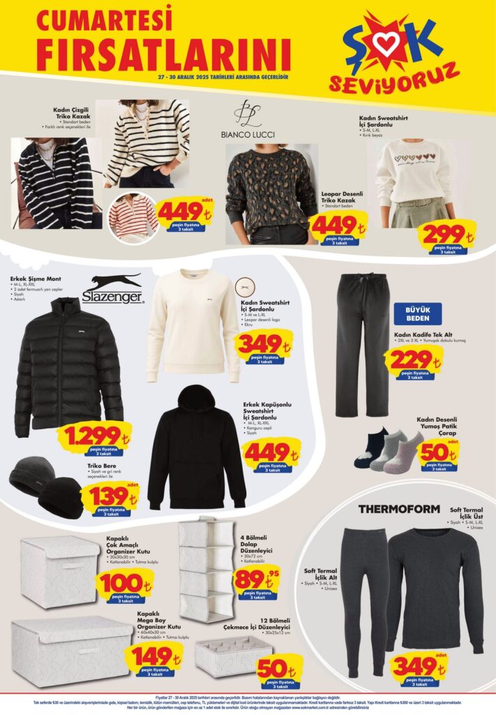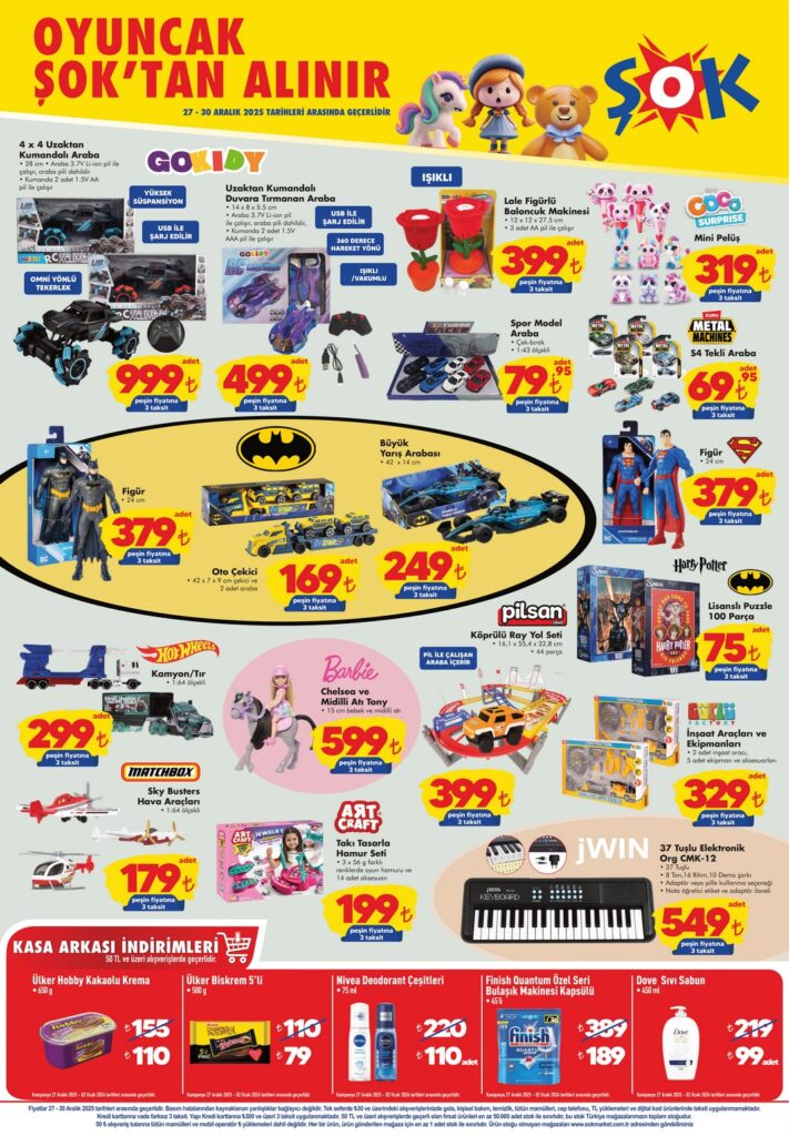 ŞOK 27-30 Aralık 2025 hafta sonu kataloğu yayınlandı! Bu hafta ŞOK’ta Slazenger erkek mont, kadın triko kazak ve termal içlik gibi kışlık giyim ürünleri ile ev düzenleyici organizerlerde kaçırılmayacak fırsatlar var. Ayrıca çocuklar için uzaktan kumandalı arabalar, lisanslı Barbie ve Batman oyuncakları ile 25 TL üzeri alışverişlerde geçerli kasa arkası indirimlerini hemen inceleyin.