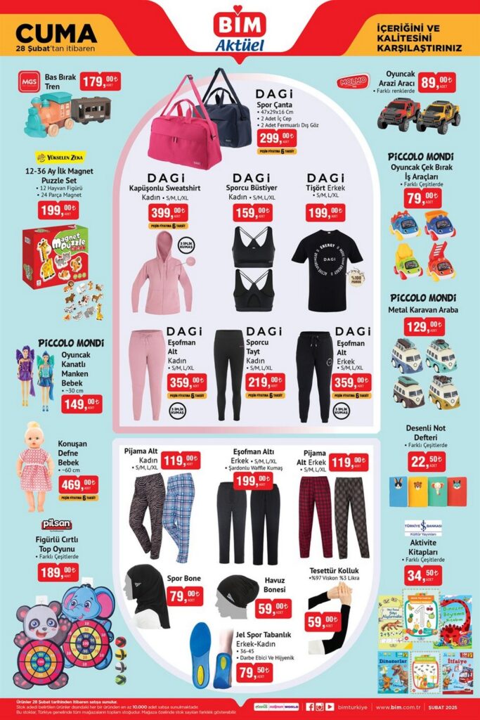 BİM 28 Şubat 2025 aktüel ürünler kataloğu, her ihtiyaca uygun fırsat ürünleriyle karşınızda! Bu hafta oyuncaklardan spor ekipmanlarına, mutfak gereçlerinden ev tekstiline kadar geniş bir ürün yelpazesi sizleri bekliyor. Kaliteli ürünleri uygun fiyatlarla sunan BİM, yaşam alanlarınıza değer katacak seçenekler sunuyor. Çocukların sevineceği oyuncaklardan mutfakta işinizi kolaylaştıracak gereçlere, şıklığı ve rahatlığı bir araya getiren tekstil ürünlerinden teknolojik yeniliklere kadar her kategoride fırsatlarla dolu bu kampanyayı kaçırmayın! Stoklarla sınırlı olan bu ürünler, 28 Şubat Cuma günü itibarıyla BİM mağazalarında sizleri bekliyor.